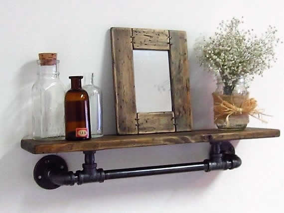 Ipari szerelvényekből készült fali-polc, öregbített deszkával.